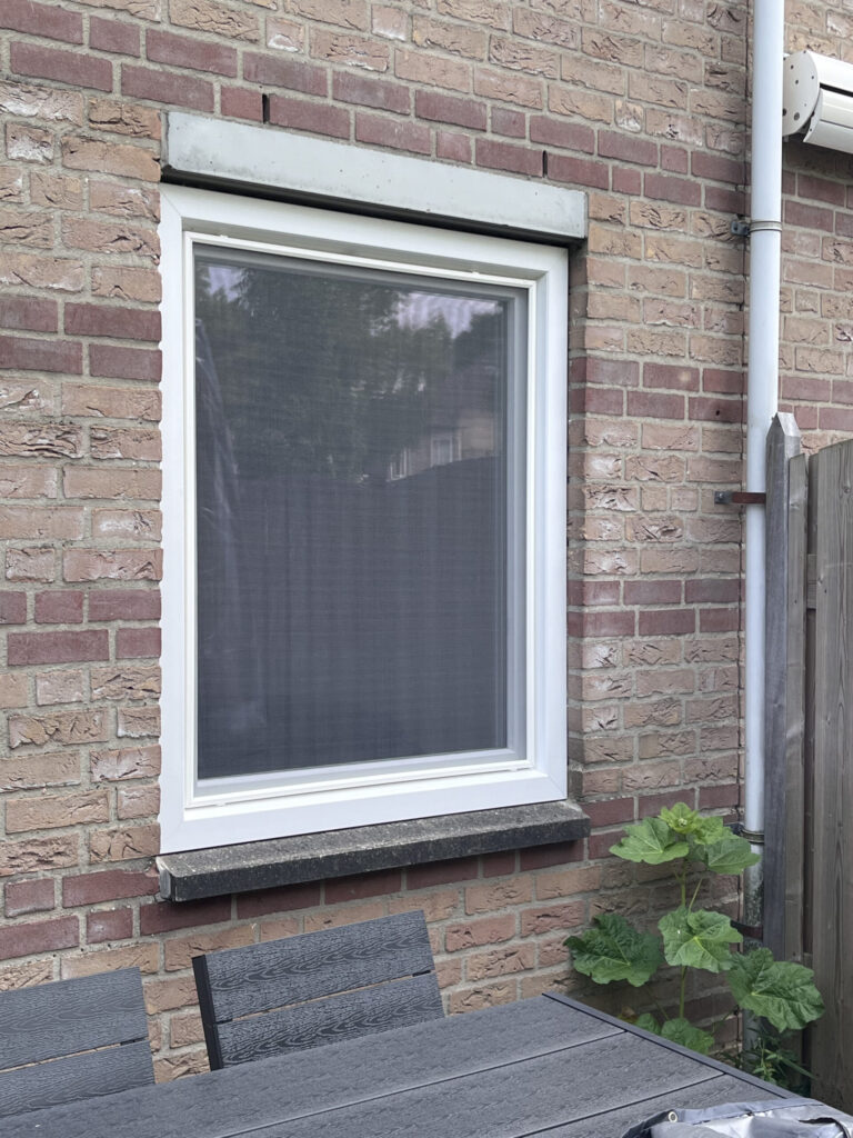 Ook heeft de klant ervoor gekozen alle kunststof draaikiep ramen te voorzien van vliegenhorren op maat & kunststof vensterbanken in de kleuren van de kozijnen.